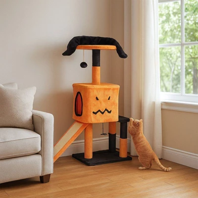 Transform your home into a festive feline playground with this Halloween Cat Tree. Featuring classic Halloween-inspired black and pumpkin-orange colors, this multi-level cat tower blends playful functionality with charm. Designed with three adventure zones—including a cozy cat condo, round perch, and wide base—this cat tree offers comfort, entertainment, and rest. It includes sisal-covered scratching posts, a detachable side scratch board, and bonus hanging toys like a ball and spider to keep your cat active and engaged. Built with sturdy board, this cat tower provides a safeand seasonal sanctuary for your indoor cat.