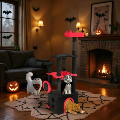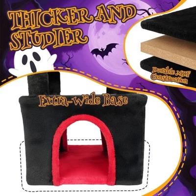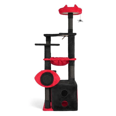 - Features dramatic black and red tones with a red eye motif and hanging spider toy for a hauntingly stylish look cats and humans will love.