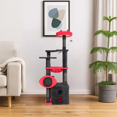 With this Large Gothic Cat Tree, designed for cat lovers who appreciate a bold and dramatic aesthetic. Styled in vivid black and red, this multi-level cat tower features a cozy padded perch, a spacious bottom condo, a soft hammock, and multiple platforms to climb, lounge, and play. With sisal-wrapped scratching posts, an eye-catching red eye decoration, and a dangling spider toy, it provides endless entertainment and comfort. Built with thick boards and a wide base for maximum stability, it includes an anti-tip kit for added safety—perfect for homes with energetic cats.