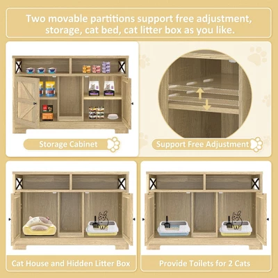 The unit features two separate cabinets with adjustable partitions, offering flexibility to accommodate one or two litter boxes, a cozy bed, or additional storage for pet supplies. Dual front doors with ventilation holes ensure privacy for your cats and help contain odors, maintaining a fresh and clean environment.