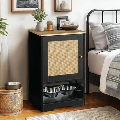 This compact 20.5″L x 14.6″W x 32.1″H pet feeding station features a pull-out drawer for easy food storage and two elevated stainless steel bowls to reduce neck strain for pets. The particle board construction includes three side hooks for leashes and collars, plus a hidden storage compartment (18.5″x12.2″x19.68″) for organizing pet supplies. The anti-tip design ensures stability during mealtime, while the sleek black finish complements any home decor. Perfect for small spaces and multi-pet households.