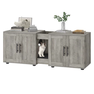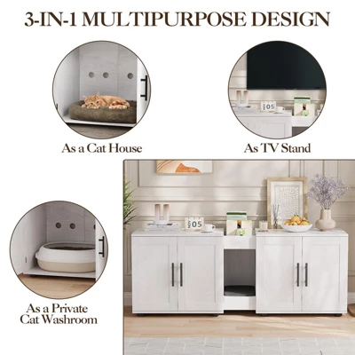 Product DescriptionTransform your home with our versatile 3-in-1 cat litter box enclosure, featuring double rooms that serve as a hidden litter box, a cat washroom, and a stylish TV stand. Ideal for multiple cats, it effectively separates dry and wet areas. Crafted from premium waterproof particleboard with a chic farmhouse white finish, it adds an elegant touch to any decor. Enhance your living space with a multifunctional piece of furniture that not only keeps your home tidy and odor-free but also serves as a cozy cat house and decorative display surface.