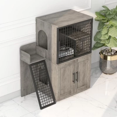 This modern double-layer litter box enclosure doubles as a sleek hidden furniture piece, ideal for large cats. Featuring a raised platform and a ladder, it creates a multi-functional cat house—serving as a private washroom while offering a cozy perch for lounging. The enclosed design hides the litter box, controlling odors and blending seamlessly with home decor, perfect for modern villas. Sturdy, spacious, and stylish, it keeps your space tidy while catering to your cat’s need for privacy and play. A practical, pet-friendly addition to any indoor setting.