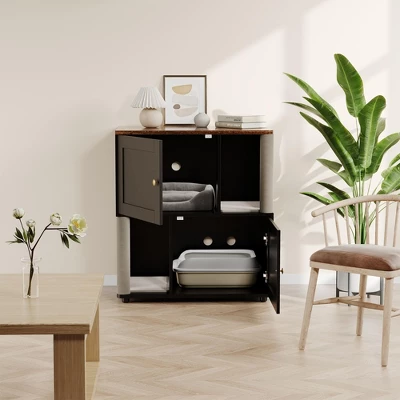 This two-tiered cat litter furniture combines a hidden litter box, cat bed, and scratching post into one piece. Featuring a modern farmhouse design, it resembles an elegant side table (dimensions: 31.5¡°L x 19.7¡±W x 34.6″H) with a weight capacity of 220 lbs. The cabinet’s dual-compartment structure (each 19.7¡°L x 19.7¡±W x 15.7″H) accommodates two standard litter boxes or beds simultaneously. This provides a separate toilet and rest area for single cats or allows multiple cats to use it comfortably at the same time. Equipped with two durable sisal-wrapped scratching posts, it satisfies cats’ natural scratching instincts while protecting furniture.