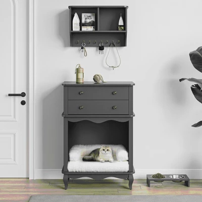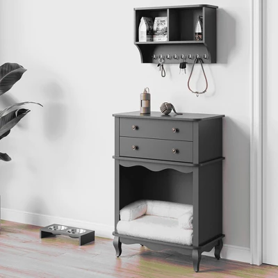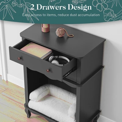 LOVMOR Vintage Small Storage Cabinet with Led Light and Pet Bed, Hidden Cat Litter Box w/ Drawer & Semi-Open Space