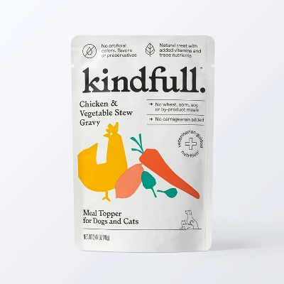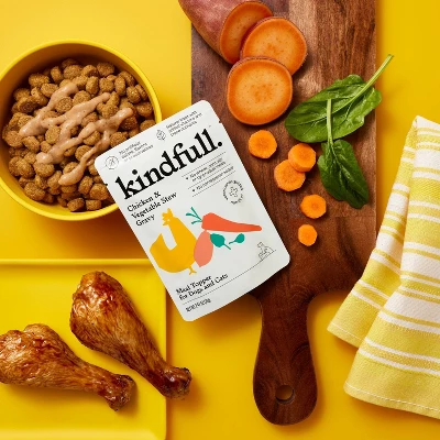 Kindfull™ Chicken & Vegetable Stew Gravy Meal Topper for Dogs and Cats is made with chicken as the first ingredient and is a wholesome, tasty way to boost your pet’s food intake. Great for picky eaters or just as a little treat, simply pour the recommended amount over their usual food and serve.
