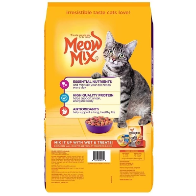 Your cat eats the same food day in and day out, so why not treat them to Meow Mix Original Choice Dry Cat Food. Made with high-quality ingredients, Meow Mix provides a healthy balanced diet for cats of all ages. Made with chicken, turkey, salmon and ocean fish, this bag of food provides all of the essential nutrients and antioxidants that your cat needs.