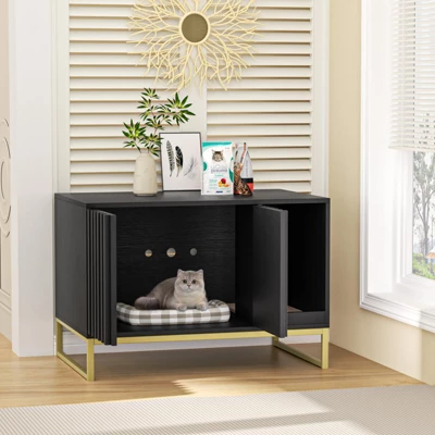 Crafted with wood-effect panels and black iron accents, this dual-door cabinet combines rustic charm with sturdy steel framing. Its enclosed design features ventilation holes for odor control while ensuring feline privacy.