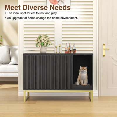 - Stylish and Durable Cat Washroom:The cat washroom storage bench featuring a mix of solid wood-effect finish,black-finished iron and thick solid fluted panels which are specially crafted with care and precision and creates a contrasting,bold and clean look.The thickened steel tube bottom frame provides strong support for the cat litter cabinet,sturdy and durable.
