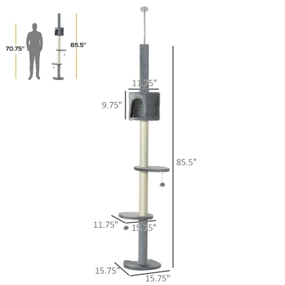 Give your cat the ultimate playground without sacrificing your style or furniture. This adjustable cat tree stretches to fit your ceiling, offering multiple tiers for climbing, scratching, and napping. Sisal-wrapped posts protect your couch from sharp claws, while the soft plush perches provide a cozy rest spot. Perfect for active cats up to 10 lbs, it¡¯s designed for fun and safety¡ªso your feline friend can play freely while you enjoy peace of mind.