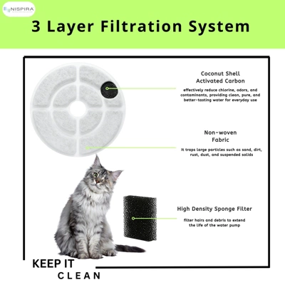 - Keep your pet’s water clean, fresh, and healthy with Nispira’s premium charcoal filters. Made with food-grade activated carbon, each filter effectively removes chlorine, unpleasant tastes, and odors — replacing them with cleaner, fresher water your pet will love.