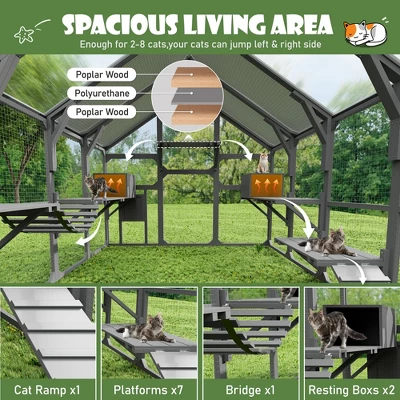 Give your cats a safe and spacious outdoor haven with this ORRD Large Catio Cat Enclosure. Built with durable wood and a protective sunshine board roof, this walk-in cat house offers 7 elevated platforms, 2 cozy resting boxes, a fun bridge, and a ramp for climbing. Perfect for multiple cats or kittens, it provides plenty of space to play, lounge, and enjoy fresh air while staying protected. Its gray finish blends beautifully with gardens, patios, or backyards, making it a stylish and functional addition to any home.
