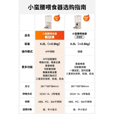 Product Code: WIFI model automatic feederPatented Supply Source: NoColors: Waist-length Feeder – WIFI Version Black, Waist-length Feeder – WIFI Version Brown, Waist-length Feeder – WIFI Version WhiteModel: AW-C-261Specification: US standard adapter 110V voltageProduct Weight: 1600Main Downstream Platform: OthersSupports APP: YesApplicable Objects: Dogs and CatsCan Be Disassembled: YesCross-border Export Exclusive Supply Source: YesPackaging List: Instruction Manual, USB Cable + Adapter, Product MachineMain Sales Region: OthersPet Intelligent Feeder: WhiteCategory: WIFI model automatic feeder