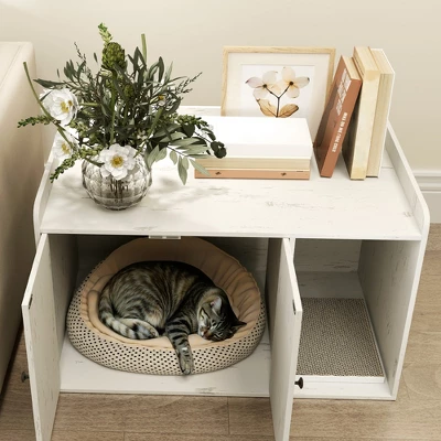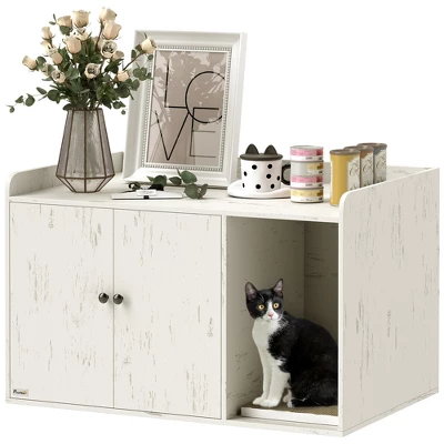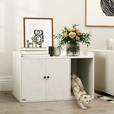 Transform your space with the PawHut Hidden Litter Box Furniture, a versatile cat furniture piece! It serves as a cat box enclosure, cozy cat house, and stylish TV stand or end table. Enjoy a cleaner, odor-reduced home thanks to its outer cat door that keeps litter in check and offers your kitty privacy.