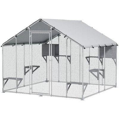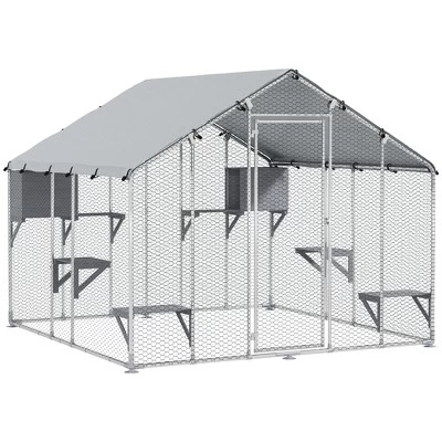Transform your backyard into a feline wonderland with the PawHut catio! Offering a sprawling 49 sq. ft of play space, it comfortably hosts up to five cats and even includes room for you to relax alongside your furry friends. Double the fun by connecting it to your home, and let your cats leap about on multiple platforms, or snuggle up in the cozy condo.