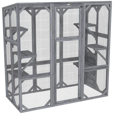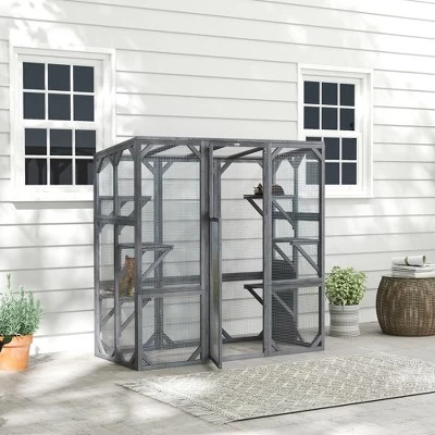 Discover the joys of the great outdoors safely with the PawHut catio outdoor cat enclosure! The back panel can be DIY, connects to different spaces, and even has a small door hole for added adventure. Its sun panel and titled roof ensure your furry friends stay cool and comfy. Suitable for up to three cats to explore the six jumping platforms in this spacious cat patio.