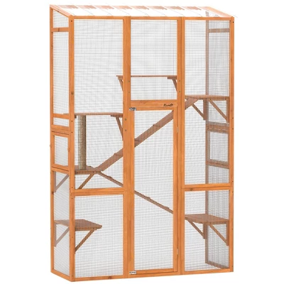 Transform your feline’s life with the PawHut large catio! This outdoor cat enclosure expands their world, safely connecting them with nature. Equipped with a protective safety net, it shields your cats from hazards while providing a spacious play area with six jumping platforms and two ramps. It is suitable for 2-3 cats to explore and lounge in their own cat patio.