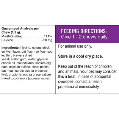 L-lysine is an amino acid that supports antibody, hormone and enzyme production, as well as providing antioxidant properties. L-lysine competes with L-arginine that is required for the replication of upper respiration pathogens. L-lysine also supports collagen formation and tissue repair to promote healthy skin. Available in a delicious chew, L-Lysine by Pet Naturals® is perfect for multi-cat households, boarding, kittens, and senior cats.