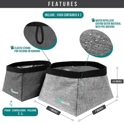 PetAmi Pet Food Travel Bag and Dog BowlThe dog food bag and bowls are a necessity for traveling with your dog or pet. The rugged large capacity food bag holds 23 cups of food while the dog bowls hold up to 8.5 cups of water or kibble so you can be well-prepared for your day trip or weekend getaway. DURABLE & WATERPROOF – Constructed of durable 600D polyester for long-lasting durability, the dog bowls have waterproof food-safe lining that prevent leaks no matter what you bring on your trip. SMALL & ULTRA-PACKABLE – Food bowls are ultra-compact and are packable down to only 4.5 x 3.5 inches. So small, they can fit into your pocket and take up very little space on the journey home. EASY TO CLEAN – the leakproof lining are stain-resistant and any dirt or residue can be simply wiped off with a damp towel. PACKAGE INCLUDES – 2x Dog Bowls (holds 8.5 cups and measures 7 x 4.5 inches). Available in 3 different colorsAbout PetAmiPetAmi builds quality pet goods for your best friend!Our VisionTo provide premium pet products so you and your pets can create more memories! Our ProductsAt PetAmi, we offer an extensive line of pet blankets and bags made of the highest quality that your best friend will love!Our products are meticulously designed with the finest materials and functions that truly simplify your life as a pet owner while providing all the key features that your pets will love.Our goal is to make it easy so you and your pets will create more loving memories.