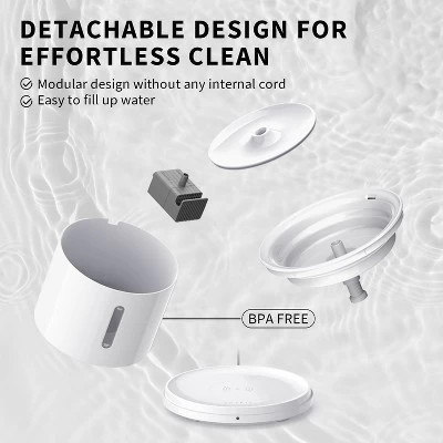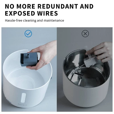 You can check the status of the water fountain through PETKIT app at any time, app will remind you when the water level is low. There are no wires on the water pump and fountain body, only one USB power cable on the base. But the base and the water fountain body can be separated, making operation safer and easier. With the detachable water fountain body and base, you won’t get the powered base wet when topping up water or cleaning up the fountain.