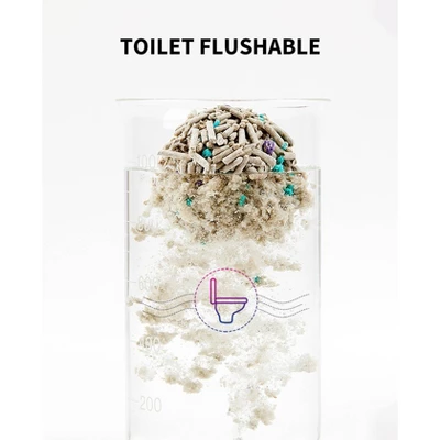 PETKIT 5 in 1 Mixed Unscented Clumping Cat Litter offers everything you could want for your kitty’s bathroom experience! The 5-in-one design includes tofu litter, activated carbon, bentonite litter, litter mate, and deodorant particles. The small-particle bentonite not only fills the gaps between the tofu litter—but it also helps increase the connection area, enhance water absorption, and encourages quick, tight clumping with no stickiness. Activated carbon and deodorant particles help control unpleasant smells, while the high hardness and low fragility helps decrease airborne dust. Plus, the two-millimeter diameter and water dissolvability make this litter safe to flush in small amounts.