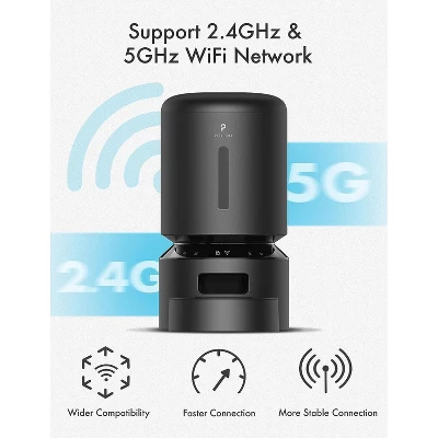 PETLIBRO Automatic Cat Feeder, 5G WiFi Pet Feeder with APP Control for Pet Dry Food, Low Food & Blockage Sensor, 1-10 Meals Per Day, Up to 10s Meal Call for Cat and Dog. Convenient APP Control: WiFi automatic cat feeder can connect to 5GHz and 2.4GHz WiFi network. Program and monitor your pet’s meals anywhere anytime through the PETLIBRO App on your iOS or Android smartphone. You can set up to 10 meals per day with 1-50 portions per meal. You can check the feeding records to ensure your cat or dog has been fed on a set schedule by APP and also can be controlled from multiple family members smartphones. Freshness in Every Bite: Patent rotor in the tank base and twist-lock lid prevent pets sneaking into the food dispenser for extra food. Built-in desiccant bag and sealing strip keep food fresh and crunchy. Food-grade stainless steel bowl provides healthy and hygienic feeding, saving your pets from chin acne. Smart Notifications and Indicators: Your phone receives notifications and the machines indicators also lights up red when the food tank is empty, food gets jammed, the battery is low, or has other problems. The infrared sensor keeps checking and stops food dispensing if the food outlet is blocked. Record a Meal Call for Your Pet: Record a voice message up to 10 seconds that plays for each feeding, and freely set the times the meal call play, your pet can feel your care even when you’re not at home. When a new voice recording is done, the old one will be deleted automatically. Dual Power Supply: Easily check the food level through the transparent window and add food in time. Coming with a 5V USB adapter, the automatic cat feeder WiFi also can be powered by 3 alkaline D-cell batteries (not included) for backup in case of power failure, ensuring scheduled feeding is uninterrupted.