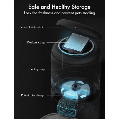 - FRESHNESS IN EVERY BITE: Patent rotor in the tank base and twist-lock lid prevent pets sneaking into the food dispenser for extra food. Built-in desiccant bag and sealing strip keep food fresh and crunchy. Food-grade stainless steel bowl provides healthy and hygienic feeding, saving your pets from chin acne. Safe and healthy storage helps lock the freshness and prevent pets from stealing.