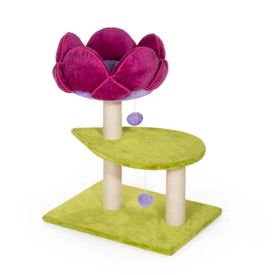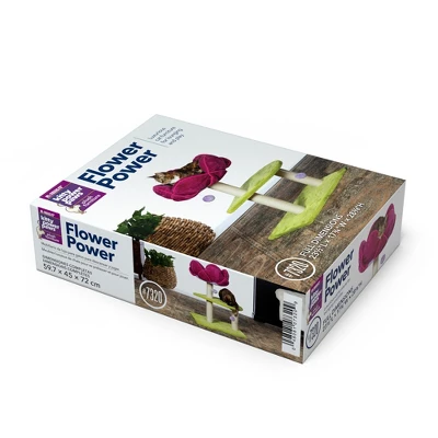 Prevue Pet Products Flower Power 7320 combines super soft, plush fabrics with durable jute to provide the perfect place for your cat to sleep, lounge and play! Two plush, dangling swat toys and lounging platform provide opportunities for pouncing and jumping. Two individual, natural, jute rope scratching posts offer an appealing texture to cats, curbing inappropriate scratching behaviors. Our incredibly plush flower bed encompassed in velvety soft pillows to surround your feline in total comfort while making your cat or kitten feel more secure and less vulnerable to sneak attacks. Our whimsical flower design in bold shades of fuchsia and lime green is sure to add a delightful presence to any room! Prevue Pet Products Flower Power 7320 measures 23 1/2″ Long, 17 3/4″ Wide, and 28 1/8″ High.