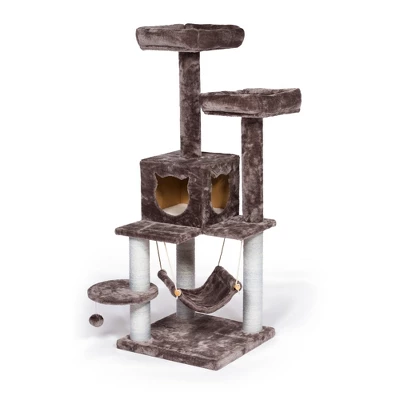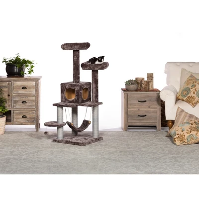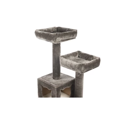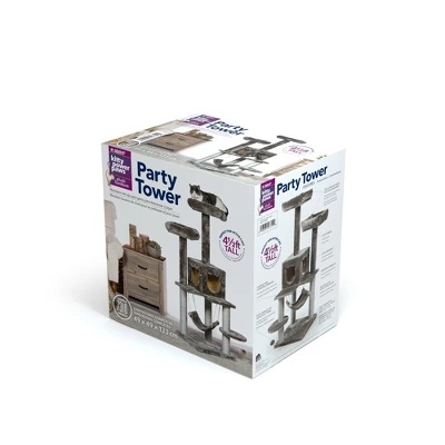 Prevue Pet Products Party Tower Gray 7310 combines super soft, plush fabrics with durable jute to provide the perfect place for lounging, sleeping, scratching, hiding and playing. Two luxurious bolstered daybeds allow multiple cats to lounge comfortably and observe their surroundings. Two jumping platforms lead to a mid-level hideaway with two kitty shaped entryways, designed to make your cat or kitten feel more secure and minimize social stress. A plush, dangling, swat toy hangs playfully from the lower level jumping platform. Three durable, jute scratching posts offer an appealing texture to cats, curbing inappropriate scratching behaviors and saving your sofa. The hanging swing hammock is exceptionally warm and cozy, attached by four sturdy metal clips. At 4 1/4 foot tall, our cat tree was designed for active cats while utilizing vertical space and a compact footprint to save space in your home. Expertly designed cat furniture assembles easily and satisfies the needs of cats of all ages, sizes and activity levels. Measures 19 1/4″ long, 19 1/4″ wide and 52 3/8″ high. The square base measures 16″ long and 16″ wide.