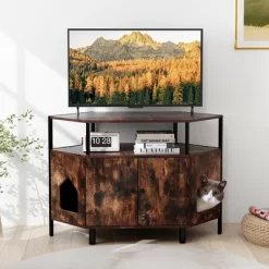 Tangkula Corner Cat Litter Box Enclosure End Table W/ Open Shelf 2 Entries Double Doors Rustic Brown