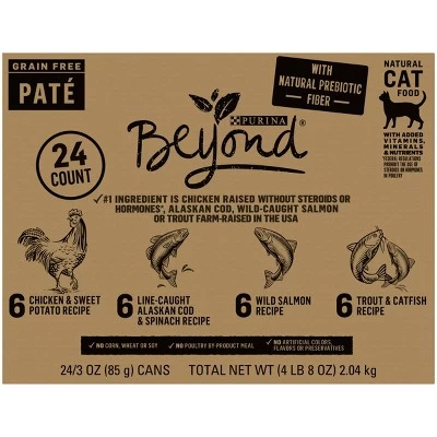 - Twenty-Four (24) 3 oz. Cans – Purina Beyond Cat Food, Natural with added vitamins, minerals, and nutrients Pate Wet Cat Food Variety Pack, Grain Free