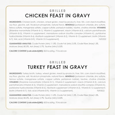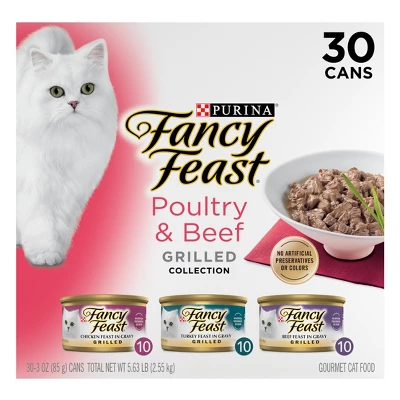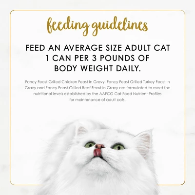 Turn mealtime into a feast with 100 percent complete and balanced Fancy Feast Grilled Poultry and Beef Collection in Gravy Canned Cat Food. With real poultry and beef and added vitamins and minerals, this Fancy Feast grilled cat food supports your cat’s overall well-being while delighting them with a savory Fancy Feast wet cat food meal made without artificial colors or preservatives. Give your feline companion a cat food with gravy offering the high-quality gourmet ingredients they deserve; give your cat Fancy Feast Grilled Poultry and Beef in Gravy Canned Cat Food.