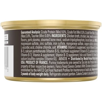Pamper your precious poultry-loving companion with Fancy Feast Savory Centers With Chicken Pate and Gourmet Gravy Center adult wet cat food. This ingenious pairing from Purina gives your discriminating feline the soft and tender chicken pate texture she loves complemented by a center filled with thick, savory gravy. The combo recipe delights your adult cat, turning mealtime into an exciting adventure, while also providing the 100% complete and balanced nutrition she needs to thrive. We craft this innovative canned cat food with real, high-quality ingredients, including essential vitamins and minerals, so she gets the great flavor she trusts Fancy Feast to deliver and you get peace of mind. Destined to be a new gold standard in gourmet cat food, Fancy Feast Savory Centers blends the texture cats love with the gravy they crave into one wholesome, flavor-filled, game-changing dining experience.