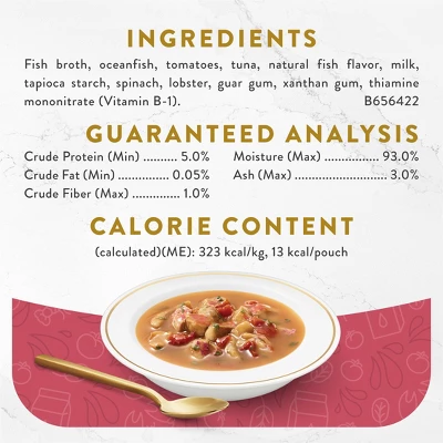 Bring mealtime to new heights for your feline with a tantalizing pouch of Purina Fancy Feast Broths Seafood Bisque and Accents of Real Lobster wet cat food complement. Our adult cat food toppers can make any moment more delightful for your kitty. Just pour a mouthwatering Fancy Feast Broths cat food complement over her favorite dish to send her on a deep-dive of fish-tastic flavor. We craft this limited ingredient wet cat food topper with no artificial flavors, colors or preservatives for a high-quality seafood bisque you can feel good serving. Plus, not only is our cat food broth grain-free, but it’s also made with accents of real lobster. Your cherished feline gets luxurious flavor added to her dish from a premium cat food topper made with Fancy Feast’s most elevated ingredients. Look to the complete Fancy Feast line-up to find more tempting recipes to pair with this gourmet cat food mixer. With over 100 items to choose from, Fancy Feast is sure to help satiate her taste for the finer things in life. Add a touch of gourmet to every meal when you complement her dish with Fancy Feast Broths grain free wet cat food complements.