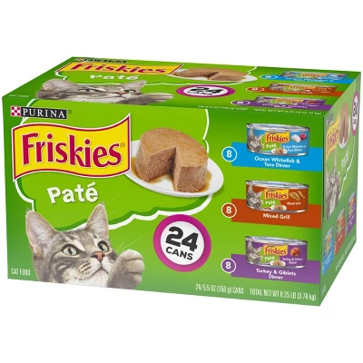Satisfy your cat’s cravings with this Purina Friskies Pate wet cat food variety pack. Three different recipes bring the poultry and seafood flavors she loves to her dish, so she can select from tempting surf or turf entrees. Each recipe features a smooth, pleasing pate, giving your cat something delectable to sink her teeth into at mealtime. After opening a can from this variety pack, tantalize your cat with its irresistible aroma to let her know she’s in for a scrumptious meal. She’s bound to love the tempting taste and texture in every bite, and you can feel good about giving her 100 percent complete and balanced nutrition, both for the growth of kittens and maintenance of adult cats. This Purina Friskies Pate collection boasts 24 cans of scrumptious wet cat food, letting you keep your pantry stocked full of yummy goodness for your cat.