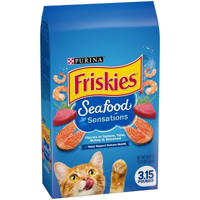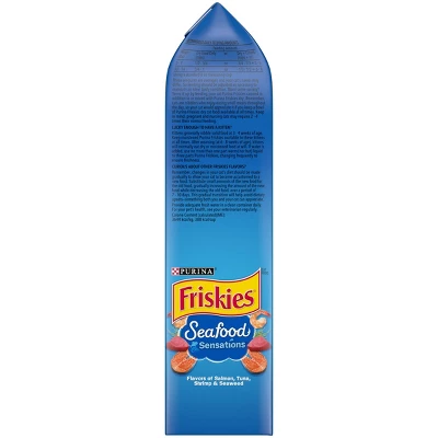Pour a purr-worthy dish full of yum with Purina Friskies Seafood Sensations dry cat food. Salmon, tuna and shrimp flavors combine to create a taste she’ll love, and a touch of seaweed flavor balances out the recipe for delicious goodness. Essential vitamins and minerals in every serving let you feel good about offering this dry cat food to your feline friend, and the seafood flavors give her plenty of reasons to finish every last delectable bite. Each serving contains 100% complete and balanced nutrition for every stage of life, so your cat can enjoy this scrumptious recipe from her playful kitten days all the way through her adventurous adult years. Let the sound of the delightful bites hitting her bowl send her prancing your way, and watch as she savors every bit of the ocean flavors. With so much goodness in every serving, she’s sure to meow for more at mealtime.