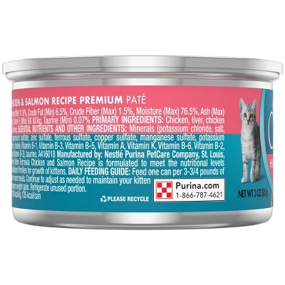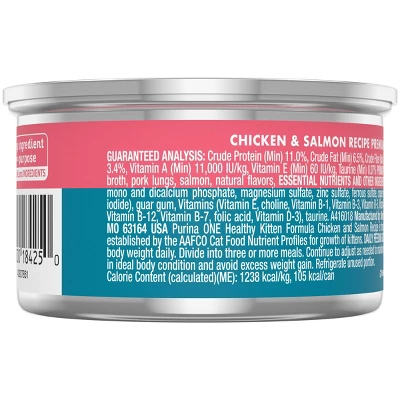 Make your growing kitten’s overall health and wellness your top priority by serving her Purina ONE Healthy Kitten Chicken and Salmon Recipe wet kitten food. Formulated to meet the nutritional needs of kittens, this wet food provides all the nutrition your little feline needs and nothing she doesn’t. The high-protein formula features real meat as the number 1 ingredient to support the development of strong, lean muscles. Our grain-free Purina ONE kitten food contains no artificial colors, flavors or preservatives. It’s free from fillers, so each ingredient serves a purpose. Every delicious serving gives your precious little one natural nutrition with added vitamins, minerals and nutrients specifically tailored to her unique needs. The moisture-rich pate is easy for small mouths to nibble and promotes healthy hydration for your kitten. Cats love this chicken and salmon recipe, and you can feel great about serving your kitten a premium, targeted-nutrition formula backed by a veterinarian-recommended brand.