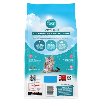 Spend more time bonding with your kitten if you have sensitivity to cat allergens, with Purina ONE LiveClear Allergen-Reducing Kitten Dry Food Formula With Real Chicken As The Number One Ingredient. This kitten food reduces the major allergen in cat hair and dander by an average of 47 percent starting in 21 days. Each serving delivers 100 percent nutrition and 0 percent fillers. Serve your kitten a daily meal that will help the two of you get closer with Purina ONE LiveClear Allergen-Reducing Kitten Dry Food Formula With Real Chicken As The Number One Ingredient.