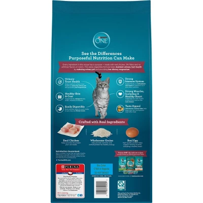 Help protect your cat’s health by regularly feeding her Purina ONE Urinary Tract Health Formula adult dry cat food. This flavorful dry food for cats helps maintain urinary tract health by reducing urinary pH and providing low magnesium content for cats with urinary tract health concerns. Made with real chicken for delicious flavor, this dry cat food contains 0% filler, which means that all the ingredients in the recipe have a purpose. Using only high-quality ingredients, this dry food combines a taste cats love with the essential nutrients that promote good health. Purina ONE Urinary Tract Health Formula adult dry cat food comes in a crunchy kibble texture that helps remove plaque and whiten your cat’s teeth. The omega-6 fatty acids help promote healthy skin and a soft, luxurious coat that you’ll enjoy petting almost as much as she enjoys mealtime.