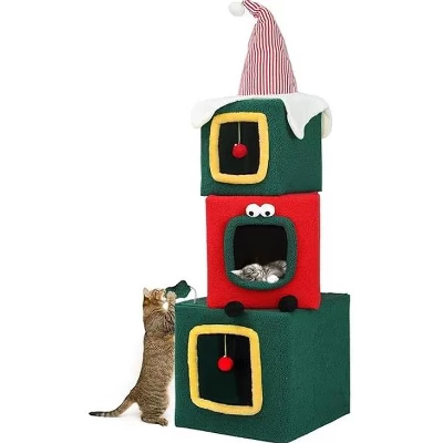 Unique Christmas Design: Christmas cat tree exhibits a distinctive Christmas tree design; Serving not only as a cat bed but also as a festive decoration for living room, balcony, and other areas, creating a vibrant Christmas atmosphere 3 Semi-Enclosed Cat Beds: Accommodating multi-cat households, our cat tree tower features 3 semi-enclosed cat beds; The 1st layer measures 18.8″L * 18.8″W * 18.8″H, the 2nd layer 17″L * 17″W * 15.7″H, and the 3rd layer 13.3″L * 13.3″W * 13.3″H Entertaining Cat Toys: Our Christmas cat tree comes with a cat teaser and bells hanging at the entrance; These elements attract their attention and add fun to their playtime Adorable Aesthetics: Our cat tree tower features a Christmas hat on top, a ribbon-decorated second layer resembling a gift box, and cute big eyes; Making it incredibly adorable and appealing to your feline friends Safety and Stability: Our cat tree includes an anti-tip device for double safety protection; This enhances the support and increases the sturdiness of the cat furniture, providing a safe and fun tree house for indoor cats