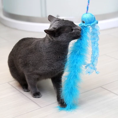 Bring out the wild side in your cat with the Quirky Kitty Jiggling Jellyfish wand! This engaging wand toy feathers double the feathers, and durable, high quality materials. As you move and swish the wand your cat’s hunting instincts will engage , watch as they hunt and stalk the jellyfish! Bust boredom and bring on active play time with the bouncy Jiggling Jellyfish wand.