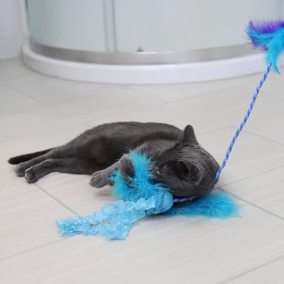 - Enticing feathers engage cat’s natural hunting instincts