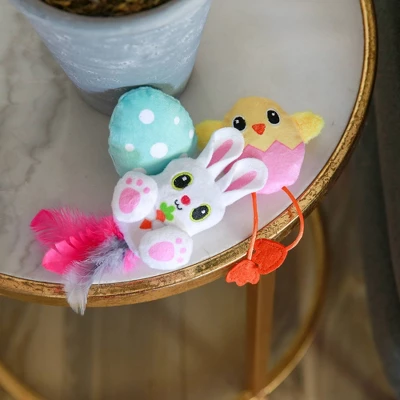 Catch that bunny! The Quirky Kitty™ Runaway Bunny cat toy 3-pack will have your kitty hopping with joy! Understanding your cat’s natural instincts is essential in forging a strong bond with your pet. Both fun and functional, Quirky Kitty™ serves as a helpful tool in choosing the best cat toys when shopping for your pet. Quirky Kitty™ durable plush cat toys are the purrrfect tool for exercising and entertaining house cats, ferrets, and other small domestic pets. Special crinkle-paper inside captures kitty’s attention by creating a sound all cats love. Filled with aromatic North American grown catnip and pesticide-free silvervine, a 100% natural plant that has potent cat attractants different from those in catnip —if your cat doesn’t like catnip, silvervine is the answer! This quirky trio includes an adorable bunny with soft feather tail, blue spotted egg, and yellow chick with long dangly legs. The Quirky Kitty™ Runaway Bunny 3 pack is a hoppy good time!