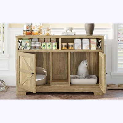- Our versatile litter box enclosure is designed with a spacious countertop and open storage compartments, perfect for storing pet food, toys, and home decor.