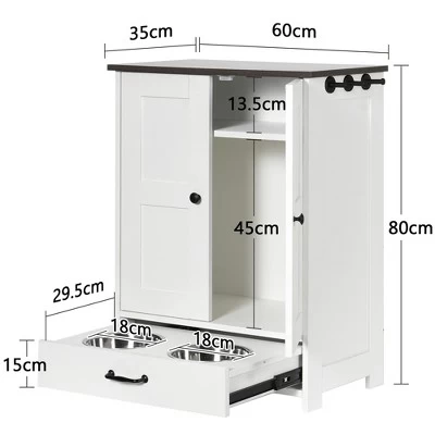 - Compared with other feeding dog bowls, our dog feeding station has three hooks on the side for hanging pet collars and dog leashes. This dog feeding station can store pet supplies, pet food, and pet toys. With this dog food storage cabinet, you no longer have to worry about a messy room.
