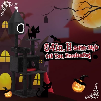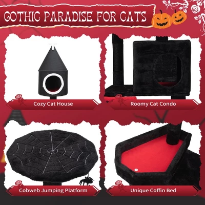 Enchanting Gothic Design: Immerse your home in the black and red elegance of freestanding gothic cat tree, plush-covered and adorned with mysterious elements like a church, coffin, cobwebs, and spiders. Elevate your feline friend’s domain while adding a touch of spooky charm to your decor.