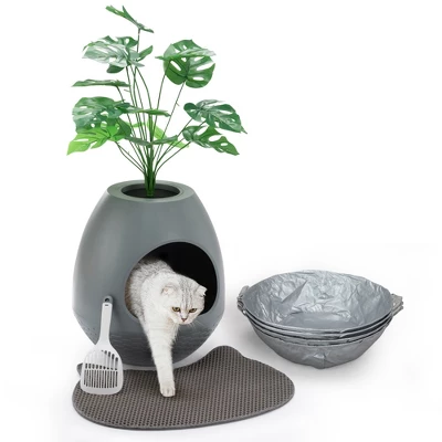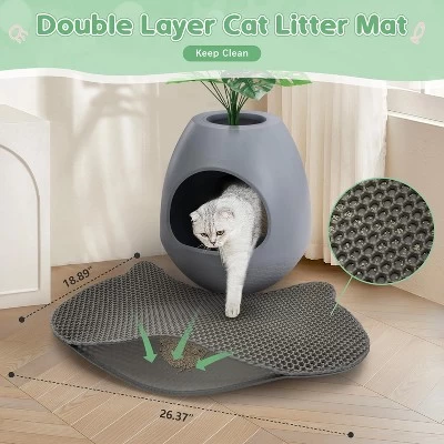 【Make It Cleaner】Because of Our 4pcs Litter Box Liners and 1pcs Cat Litter Mat. Durable, washable, and reusable litter liners and cat litter mat has you covered. It’s the purrfect solution for cat owners who value convenience and sustainability. Keep your litter box clean, skip the cleaning, replace it straight away liners. Reject unsightly litter box, and keep your Cat Litter Box clean while reducing waste【Odor-Free】Our cat litter boxes had upgraded structure, Large enough to dissipate odors quickly. Cat Litter Mat, Honeycomb design Cat Litter Mat helps you gather the litter. No more getting litter stuck to your feet and cleaning your floor on daily basis, Stopping odors【All-In-One Solution – Litter Box】Our litter box set comes equipped with 1X Cat Litter Mat, 4X Litter Box Liners, 4X Carbon Filter, and a litter scoop, Eggloa6 large plant cat litter box grows with your cat, making litter tray visits a breeze【Cat-Friendly Special Litter Box】 Constructed using durable ABS, this cat litter box is sturdy, waterproof, not easy to deform. This door (12″L x 9″W) easy for your cat to access, Ideal for your cat, kitty, bunny, rabbit, and other pets. The removable Litter Box offers easy access for quick cleanup, Easy to assemble and built to last. With a wide and stable base, even for active cats without worries of tipping over【Uniquely Designed Litter Box】Our hidden litter box furniture features an innovative Egg-Like design, effortlessly concealing it in unused corners or blending harmoniously with your existing furniture. The top plant pot gives you the freedom to choose fish farming, live plants, or something more appealing that complements your home decor, not only artificial leaves, create your own natural displayGive your beloved cat the privacy it deserves while elevating the ambiance of your living space with our Eggloa6 Hidden Litter Box. Inspired by the egg shape, this innovative litter box with an artificial Monstera deliciosa offers your feline friend a safe semi-enclosed bathroom, breaking the boredom of the traditional litter box. The top of the corner litter planter invites you to DIY with live plants, artificial flowers, or cat toys, creating a personalized style. Your cat will love to pee and poop inside and enjoy undisturbed comfort. The matching claw-friendly litter mat helps you gather the litter easily and ease the hassle of litter messes, while the removable litter bags make the clean a breeze. This cat furniture is the optimal addition to encourage proper potty habits.