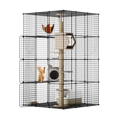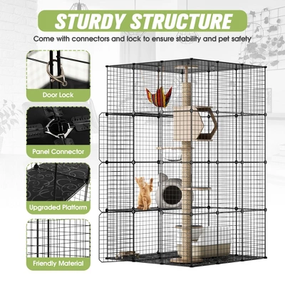 Are you looking for a large hose for your cats to enjoy the enrichment of nature? This 4-Tier Large Cat Cage is definitely the one you want. Decorating the spacious playpen with your cat hammock, cat tree, etc, your lovely cats are allowed to perform their instincts like climbing and lounging on high, rather than taking over your furniture. Place this wire catio outside your window for cats to breathe the fresh air, enjoy nature and be happier.【Spacious 4 Tiers for Fun】: This cat cage, featuring 3 resting platforms, offers roomy space to hold cat supplies and allows at least 2 cats to play and live together. Suitable for small animals, such as guinea pigs, ferrets, rabbits, chinchillas, etc.【DIY Layout with Superior Safety】: With 48 mesh sheets and 30 resin sheets, this cat enclosure can be flexibly set up into any structure you desire. Enhanced with M-shape nails, cable ties, and anti-tilt kits, the cat crate ensures great stability.【Keep Home Mess Contained】: Measuring 42.52″L x 42.52″W x 72.05″H, this cat kennel can accommodate your cat tree, cat hammock, cat litter box, and more for a variety of activities, keeping pets active at home and protecting your furniture from damage.【Doubles as a Window Catio】: Made of premium wire mesh with a rust-proof finish, this waterproof cat house can be placed against the exterior of the window with 1 or more sheets removed, allowing cats to roam in and out safely and freely.【Easy to Access and Clean】: Open the 4 doors and you can easily walk in to interact with your furry friends or to clean the interior. When your are going out, lock the doors to prevent predators or pet escape.