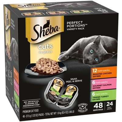 Your cat knows what they want, and knows how to get it. Give them SHEBA Wet Cat Food. Each SHEBA Cuts in Gravy recipe is made with real protein, essential vitamins, and minerals, so it’s as nutritious as it is delicious. This wet cat food is made without corn and artificial flavors or preservatives; and since it’s so delectable and easy to chew, your cat will devour every tasty bite. SHEBA PERFECT PORTIONS Cuts in Gravy Wet Cat Food offers two convenient servings in right-sized trays to ensure freshness without leftovers. Show your cat some love; whether your fancy feline is a kitten, adult, or senior cat, this soft wet food is sure to satisfy even the pickiest appetite. Savor every delicious moment with SHEBA Wet Cat Food: What Cats Want.