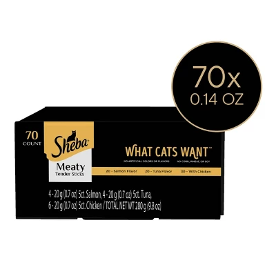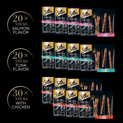 - Variety Pack: Contains seventy (70) 0.14 oz. Sheba Meaty Tender Sticks: (30) with Chicken, (20) Tuna Flavor, (20) Salmon Flavor.